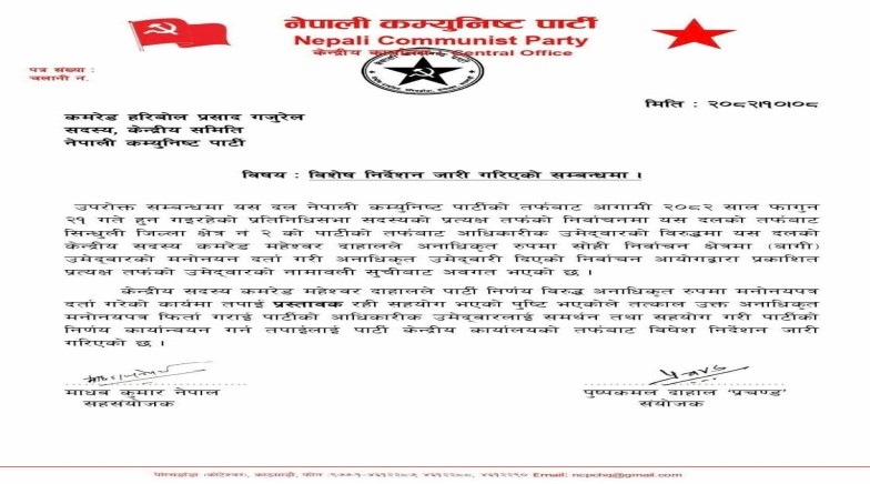 पार्टी केन्द्रीय कार्यालयद्वारा जारी निर्देशन अनुसार, आगामी २०८२ साल फागुन २१ गते हुने प्रतिनिधिसभा सदस्यको प्रत्यक्ष निर्वाचनका लागि सिन्धुली जिल्ला क्षेत्र नं। २ मा पार्टीका आधिकारिक उम्मेदवारविरुद्ध केन्द्रीय सदस्य महेश्वर दाहालले अनधिकृत रूपमा उम्मेदवारी मनोनयन दर्ता गराएका कारण निर्वाचन आयोगले प्रकाशित गरेको प्रत्यक्षतर्फको उम्मेदवार नामावलीबाट उक्त उम्मेदवारी अवरुद्ध भएको जनाइएको छ।